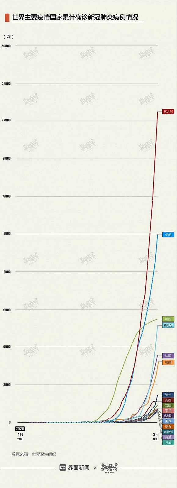 界面新闻数据组曾整理过世界主要疫情国家累计确诊新冠肺炎病例情况,自3月开始,欧洲国家的确诊病例迅猛增长。而恐慌性购买、超市货架空无一物,在这些地方的新闻中陆续涌现。